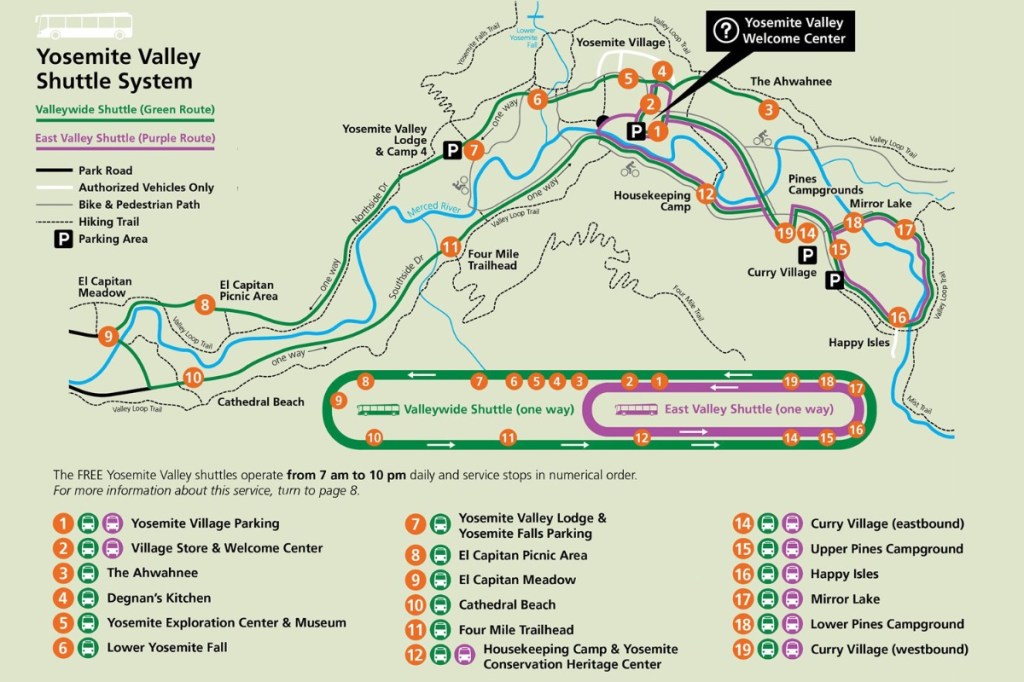 - Yosemite Shuttle: Free shuttle service operates in Yosemite Valley.